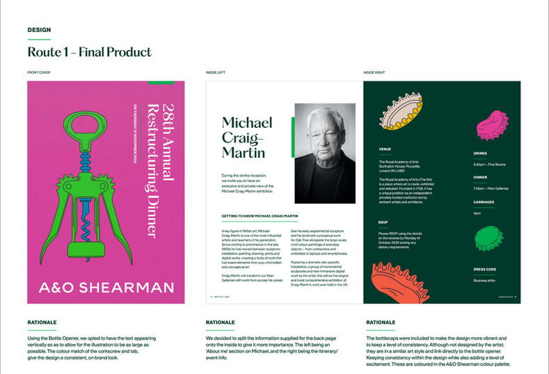 This route in the end would become the chosen design for the 25th Annual restructuring dinner of A&O Shearman. I've included collateral samples below to show how the final work came to life.